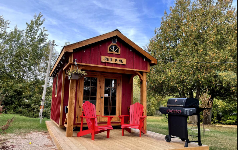 The bunkie's retro-inspired look—with its dark red wooden exterior—stands out right away. Inside, you'll find just what you need: a love seat, a double bed, and a loft bed for an adventurer. Despite its small size, natural light and thoughtful layout make the space feel welcoming and comfortable. vrbo.comBasics that make life easier
