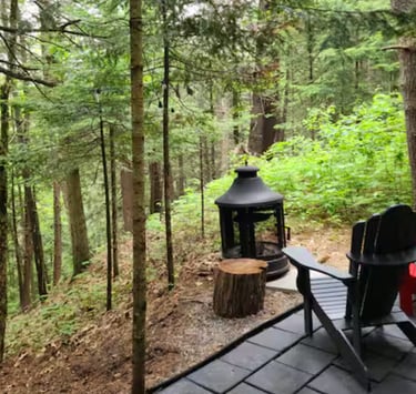 Just outside, guests can relax by the firepit, enjoy a BBQ, or explore private trails through the surrounding forest.