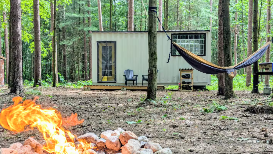 Tucked deep within 74 acres of Carolinian forest near Simcoe, Ontario, Little Can in the Pines is the kind of place that instantly shifts the dial from everyday noise to forest calm. Here, you’re not just stepping into a place to sleep — you’re entering a pocket of quiet that feels far removed from traffic, alerts, and routine.