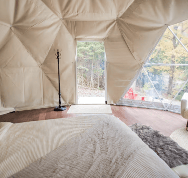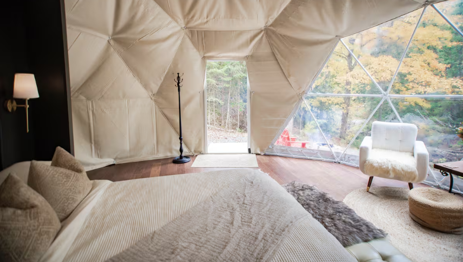 Inside the dome, you’ll find a cozy and modern space that keeps things minimal. There’s no clutter, no noise—just a clean design and peaceful views of nature all around you.