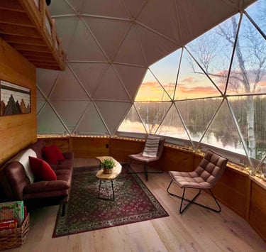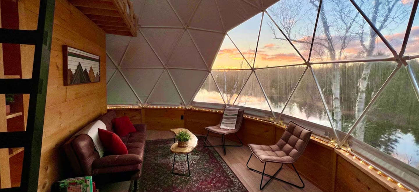 Unlike traditional cabins, this stay takes place inside a geodesic dome, giving guests panoramic views of the surrounding landscape. The curved structure creates an open and airy atmosphere while still feeling warm and cozy.