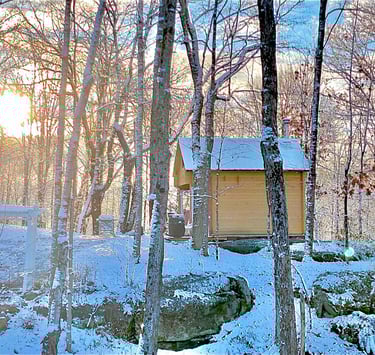 Inside, the wood finishes and big windows bring you right into the forest. Outside, you’ll cook under the sky, listen to birds, watch turkeys or deer wander through, and feel the sun dip. The absence of showers (you wash with hot kettle water) is part of the design: pure nature immersion.