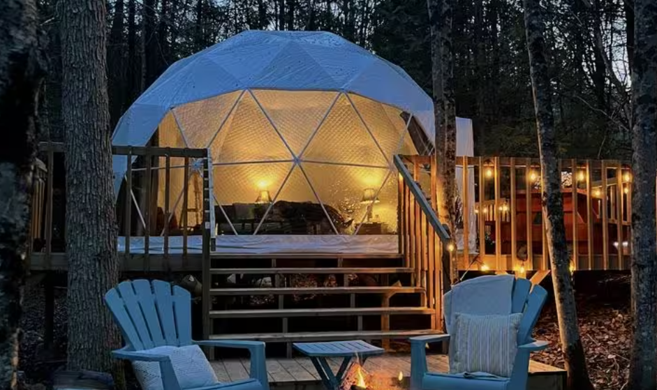 Tucked within 59.1 private acres, this glamping site offers guests the rare opportunity to experience both luxury and wilderness. The dome itself is designed to bring the outdoors in—featuring expansive bay windows and a skylight that allows you to fall asleep under the stars and wake to the gentle glow of the morning sun.