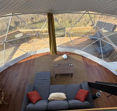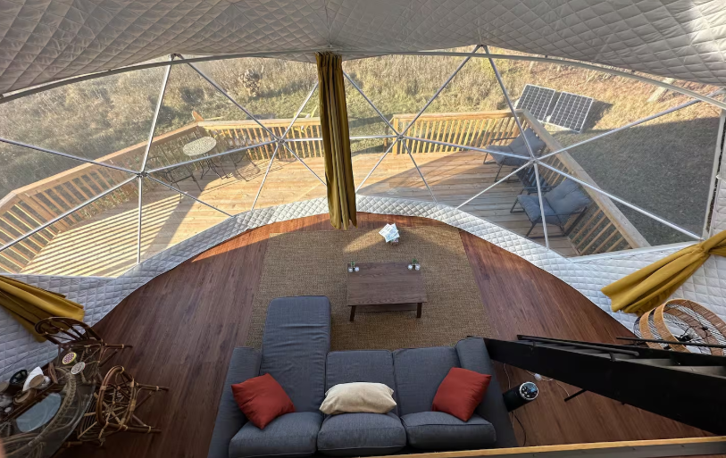 Unplug and recharge. This dome runs off-grid, and that peace shows in every sunlit corner and soft shadow.